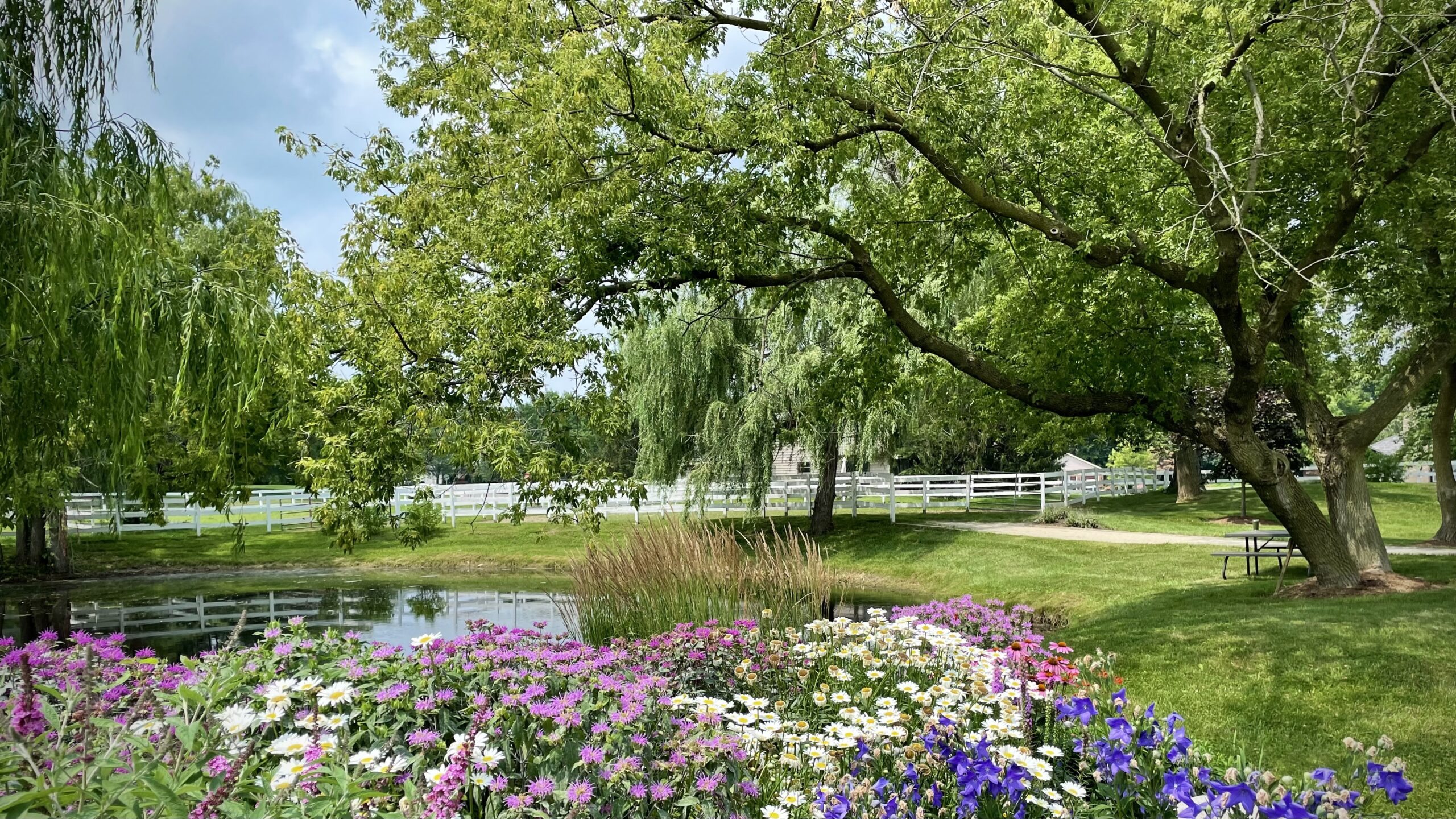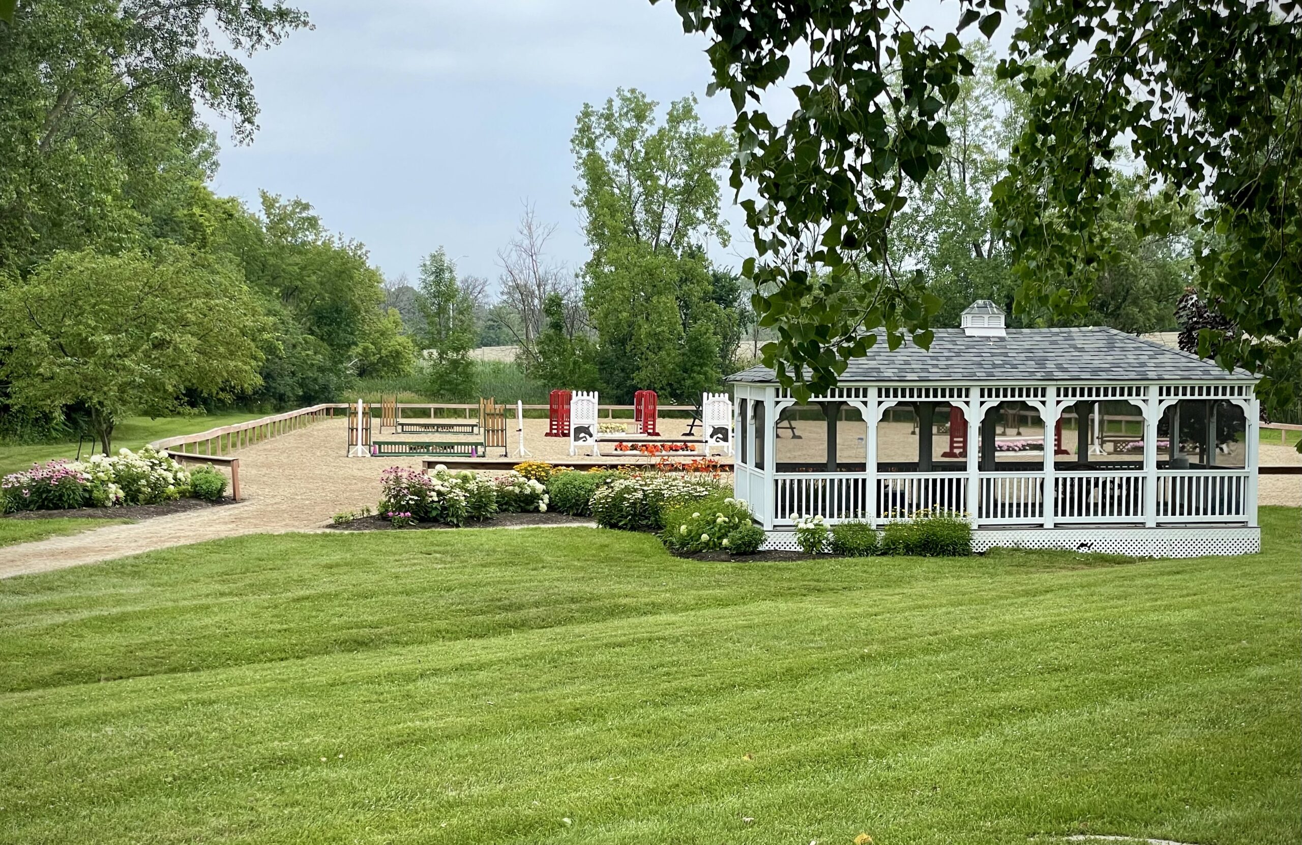 In the summer, you will enjoy our large, outdoor arena and adjacent hunt field. We also have a 1/3 mile grass racetrack, encircling a large pond. Spectators can watch from the comfort of a screened-in gazebo.