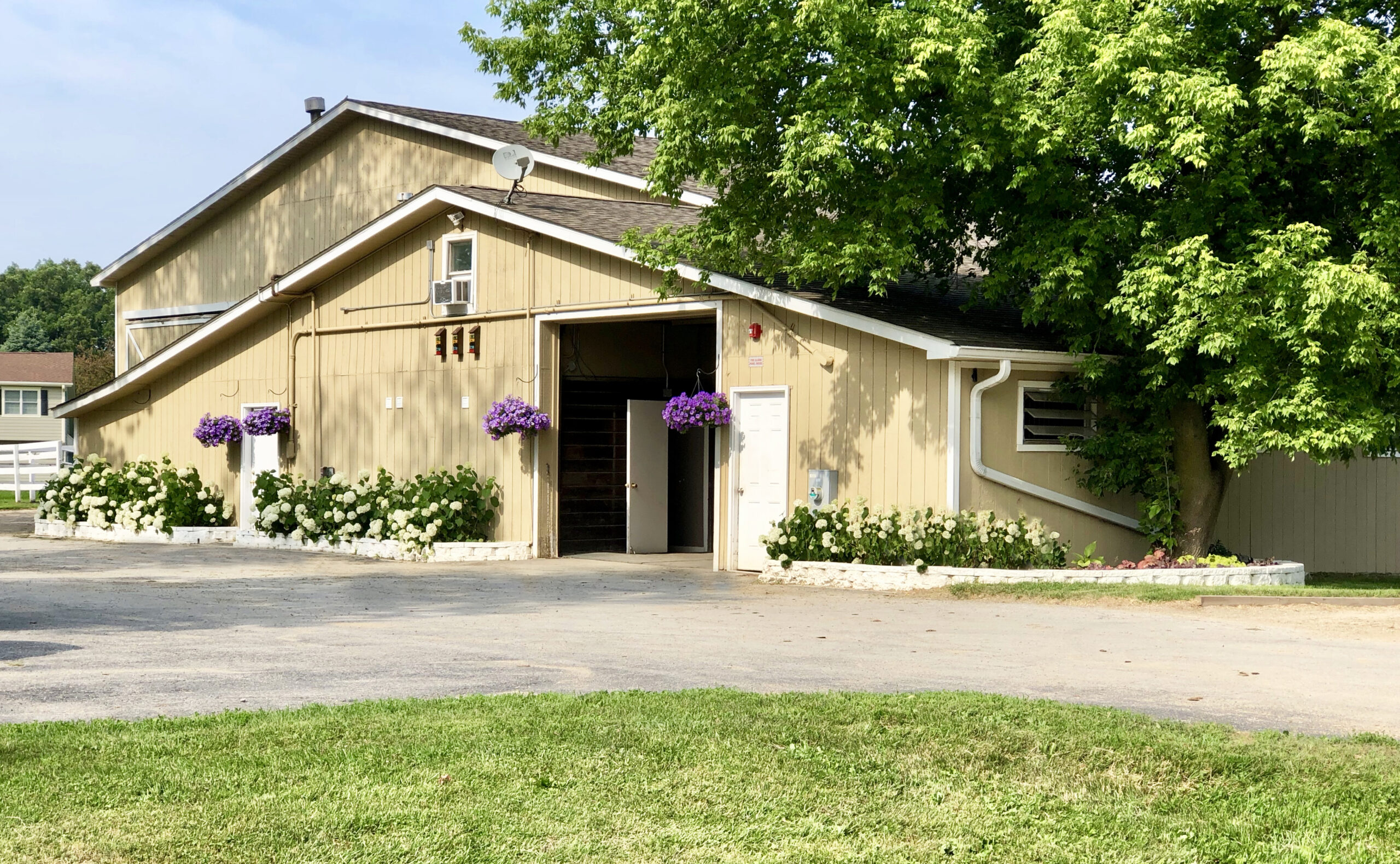 Our full-service barn is located on lush, wooded land, in a quiet suburban area. Four grass paddocks alongside five all-weather paddocks provide excellent turnout for your horse in almost any weather conditions.